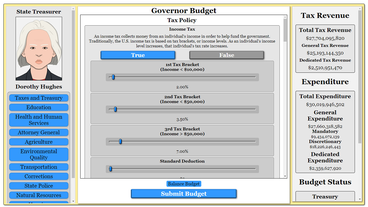 Budgets in the game are based on real-life budget data, and thus give a simplified, but fairly accurate, representation of the budget process. You will have to make the kind of budget decisions that real-life politicians make.