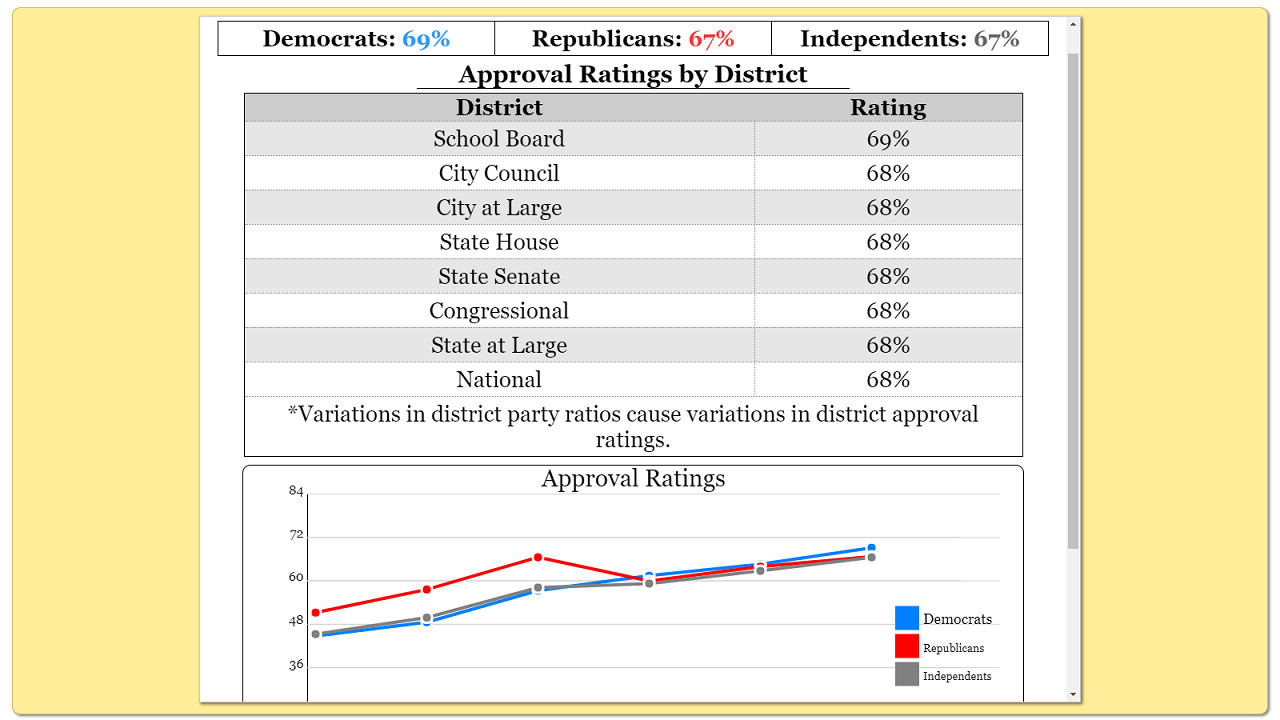 Fine-tune district details to create the world exactly as you want it. There are over 80 variables you can change in the advanced options, such as voter demographics, ideology, and turnout, district population, poverty rates, and more.