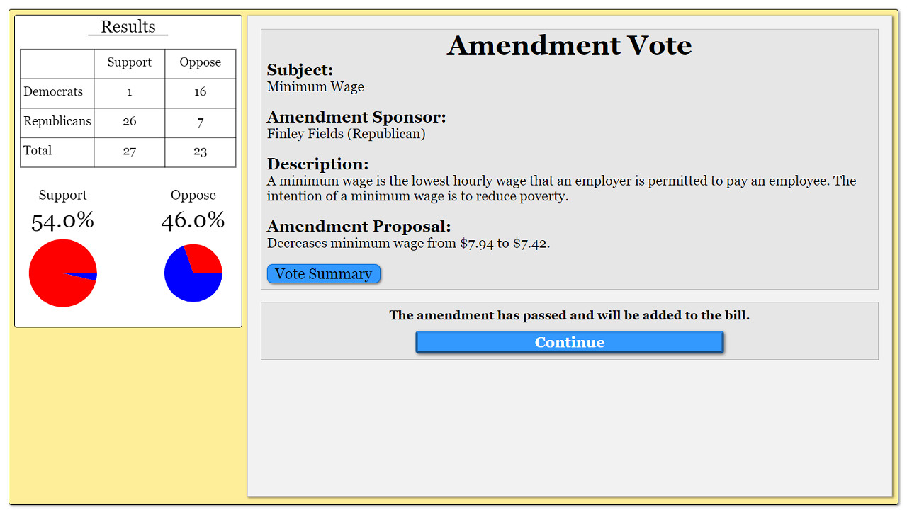 Before legislation can become law, it must progress through the legislature - through committee hearings, amendments, and voting. Politicians will vote on the legislation based on their unique ideologies and policy positions. If the legislation passes in the legislature, it will be sent to the executive branch (mayor, governor, or president) to be signed into law or vetoed. Legislation that becomes law will influence various in-game metrics.