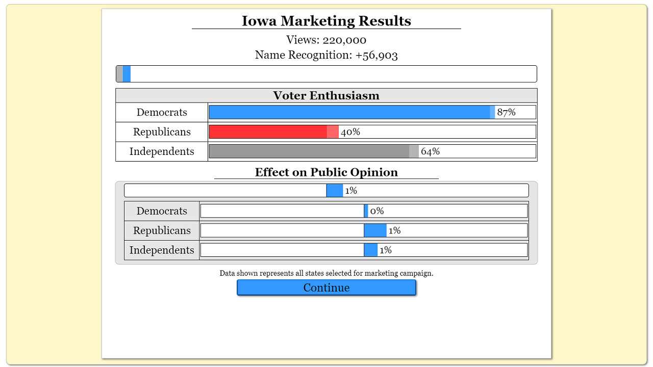 For the ultimate election challenge, you can run for president. The presidential election is even more in-depth because you must decide how to divide your resources among all 50 states. Which states are guaranteed wins, which can you flip, and which can you ignore. Each state is different, so you will have to adjust your message accordingly. Will you go after the independent voters in swing states, try to increase voter turnout among your supporters, or use attack ads to decrease voter enthusiasm for your opponent? With the correct strategy, you may become the next president. But, your strategy cannot focus only on winning your election. If you want to be a successful president, you will need a majority in congress. That means that your party members need to win elections. To help party members win elections, you may need to campaign in states that you cannot win. Campaigning in such states may increase voter turnout enough to help members of your party win their elections. There are many strategic decisions to make when campaigning for president.