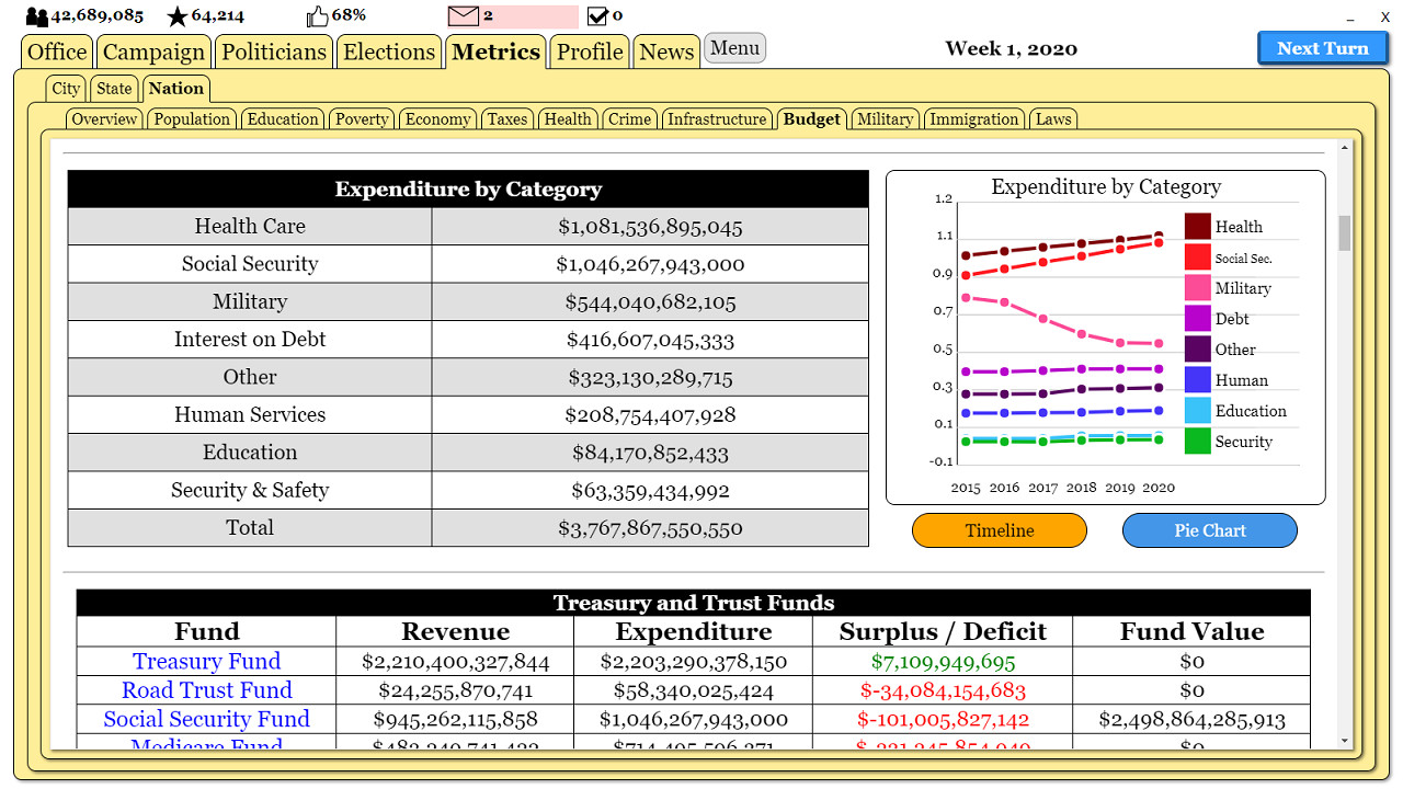 Outside the political world, there is also the world of your constituents. The game simulates over 100 metrics based on default conditions and government policies. Watch how metrics change over time based on the policies that you and your colleagues create. Will you reduce poverty, improve education, eliminate the federal deficit?