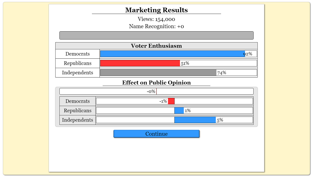 • When running for political office, you must run as a Democrat or a Republican. You cannot play as an independent. Even though you have to campaign as a Democrat or Republican, you do not have to act like them. You can play with whatever ideology and policy combinations that you want.