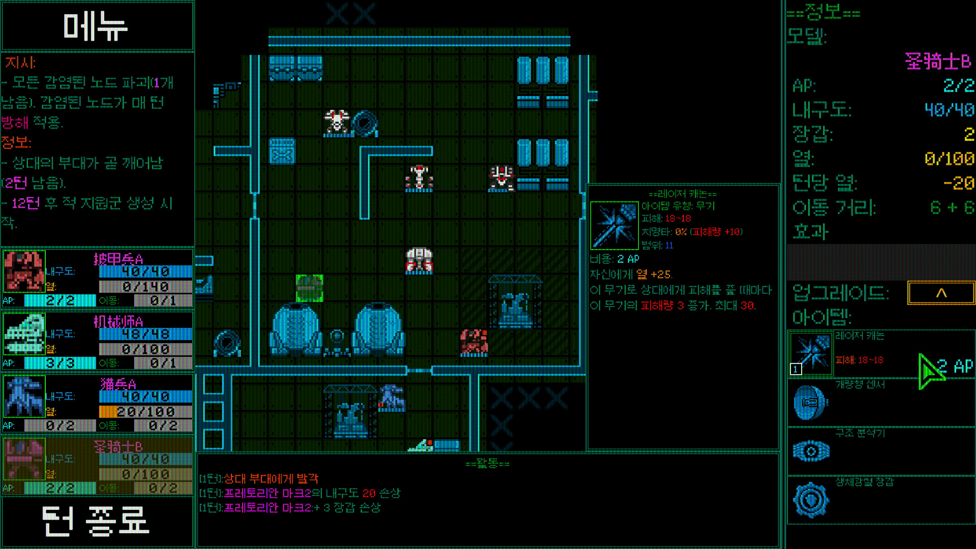 는 복고미래주의 감성의 전략 게임입니다. 컴퓨터 바이러스가 스타게이저 연구 시설의 방어 시스템을 뚫고 침투하였습니다. 시설에 보관 중이던 거의 모든 로봇이 감염되었습니다. 4기의 프로토타입으로 이루어진 부대를 지휘하여 메인프레임을 방어하세요. 시설의 가장 깊숙한 곳으로 진입하며 적의 공격을 물리치고, 유닛 제조기를 파괴하고, 귀중한 데이터를 다운로드하고, 감염된 노드를 확보하는 등 다양한 임무를 수행해야 합니다. 아이템의 제한 사항과 단점을 우회할 방법을 찾아 강력한 조합을 만드세요. 과열, 부식, 피해 흡수, 반격 등 다양한 전술로 적을 처치하세요. 적에게 대처할 수단이 있을지도 모르니 한 가지 전략에만 너무 의존해서는 안 됩니다. 하지만 임무가 무엇보다도 중요합니다. 메인프레임을 방어하세요!