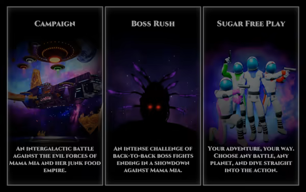 Du faller i junk food-koma under en nattlig film-maraton, våkner som astronaut strandet i en galakse tatt over av levende junk food! Spill solo eller online co-op med opptil 3 venner (max 4 spillere) mot horder av snacks og Souls-lignende bosser for å overleve og rømme!