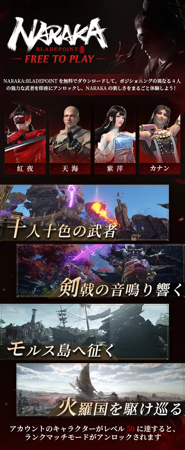 『NARAKA: BLADEPOINT』で、東洋の伝説の世界に飛び込もう。友達とチームを組み、痛快な格闘戦で、至高のバトルロイヤルを楽しもう。個性豊かな武技を持つ多彩な武者を操作し、独自のバトルスタイルを構築しよう。2,000万人以上のプレイヤーが、キミの参戦を待っている!さあ、今すぐ無料でプレイしよう!
