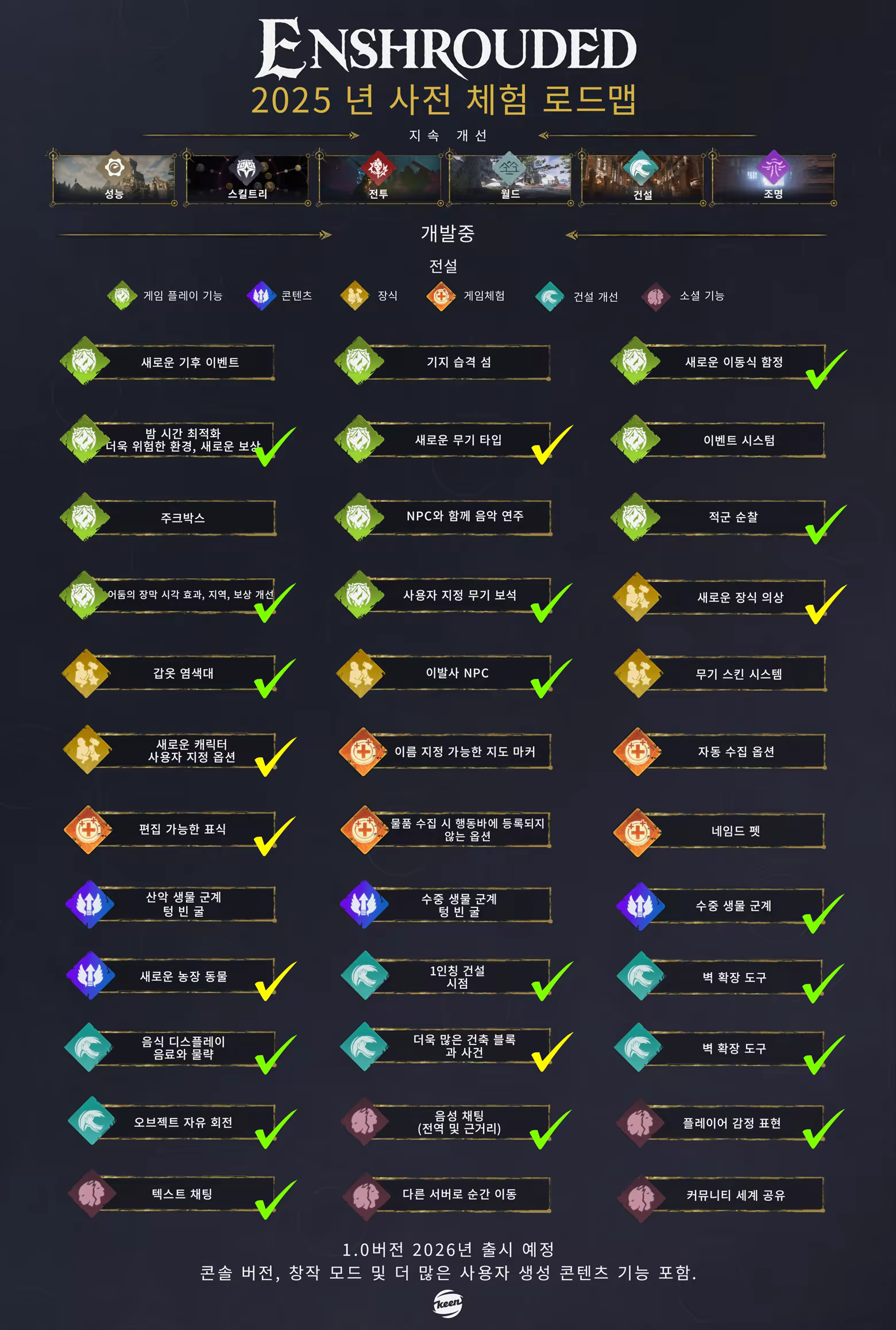“Enshrouded는 핵심 게임플레이 요소와 관련하여 완벽한 경험이 될 것입니다. 그러나 앞서 해보기 단계에서는 커뮤니티의 피드백에 따라 게임플레이 기능을 개선하고 추가할 계획입니다. 그 외에도, 세계관을 크게 확장할 계획입니다. 여기에는 새로운 적과 새로운 유형의 지역으로 채워진 새로운 생태군이 포함될 것입니다. 또한, 새로운 생태군은 더 많은 제작 자원과 제조법, 그리고 더 많은 장비와 무기 계층을 의미합니다. 레벨을 올리는 동안 플레이어는 스킬 트리에서 추가 스킬을 탐색할 수 있습니다. 플레이어 기지의 경우, 플레이어가 건물 창작물로 자신을 더욱 잘 표현할 수 있도록 더 다양한 장식용 가구와 건축 자재가 계획되어 있습니다.”