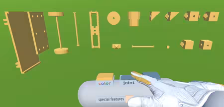 Grasp the part by pressing the button on the control, immobilize it completely and carefully place the second part into it. Finally, release both buttons and you so to create the assembling. It is possible to move the connected parts by using another block or by open hand. Today computers can handle about one hundred and fifty these objects in the scene.