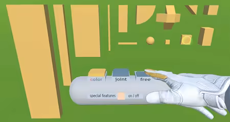 Grasp the part by pressing the button on the control, immobilize it completely and carefully place the second part into it. Finally, release both buttons and you so to create the assembling. It is possible to move the connected parts by using another block or by open hand. Today computers can handle about one hundred and fifty these objects in the scene.