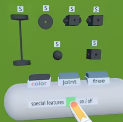 For simplicity, these parts always have a black color and are marked with the letter "S". By incorporating these objects into the construction is possible to make moving construction. The parts perform rotary and sliding movements. It is possible to combine different types of movements. Switching these functions on and off is done by the "special feature" button.