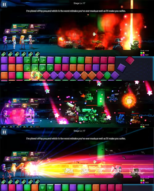 Girls came to a world of box. The robot NPC in here has an abnormality. We must sanction against these NPCs. In combat, players need to eliminate blocks to launch skills. You can combine blocks to get props and skills, or you can gain extra abilities through passive skills.