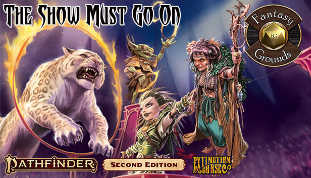 "The Show Must Go On" is a Pathfinder Second Edition adventure for four 1st-level characters. This adventure begins the Extinction Curse Adventure Path, a six-part, monthly campaign in which the heroes lead a traveling circus as they unravel a plot to eradicate all life from the Starstone Isles at the heart of the Inner Sea. The adventure also includes advice on how to run a traveling circus, new circus-themed rules, and a menagerie of monsters both wondrous and wicked.