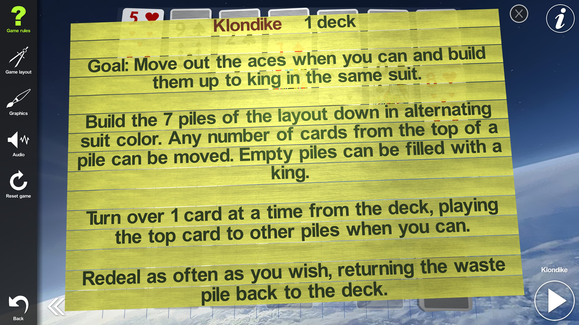 Personalize every game with a choice of card layouts, and rate each game with up to 5 stars. Drag cards, throw cards, or move them automatically with a single touch. A simple user interface offers a high degree of customization, and a wide variety of graphic options. Features include options for card messiness, intelligent auto-play to foundations, auto-flip, hints, unlimited undo and redo, statistics, and the skill-testing pro mode.