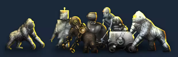 SCIENCE! A 1920s Art Deco world chock full of giant gorillas, spiteful robots, and highly combustible blimps. Battle friends in turn-based combat or play alone and help Victor the gorilla escape 22 levels of robotic revolt! Inspired by the classic artillery game, Qbasic Gorillas.