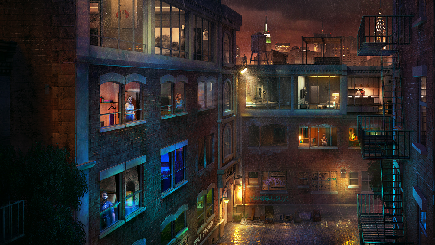 Inspired by Hitchcock’s anxiety driven storytelling, from the moment Fire Escape’s action begins, you will have free range to seamlessly select apartments, and hear the intimate conversations of your neighbors across the alleyway. When a murder occurs in the gentrifying building, you must peer into the lives of the diverse tenants of the building, while making difficult narrative choices to discover the hidden secrets that will unwrap the mystery.