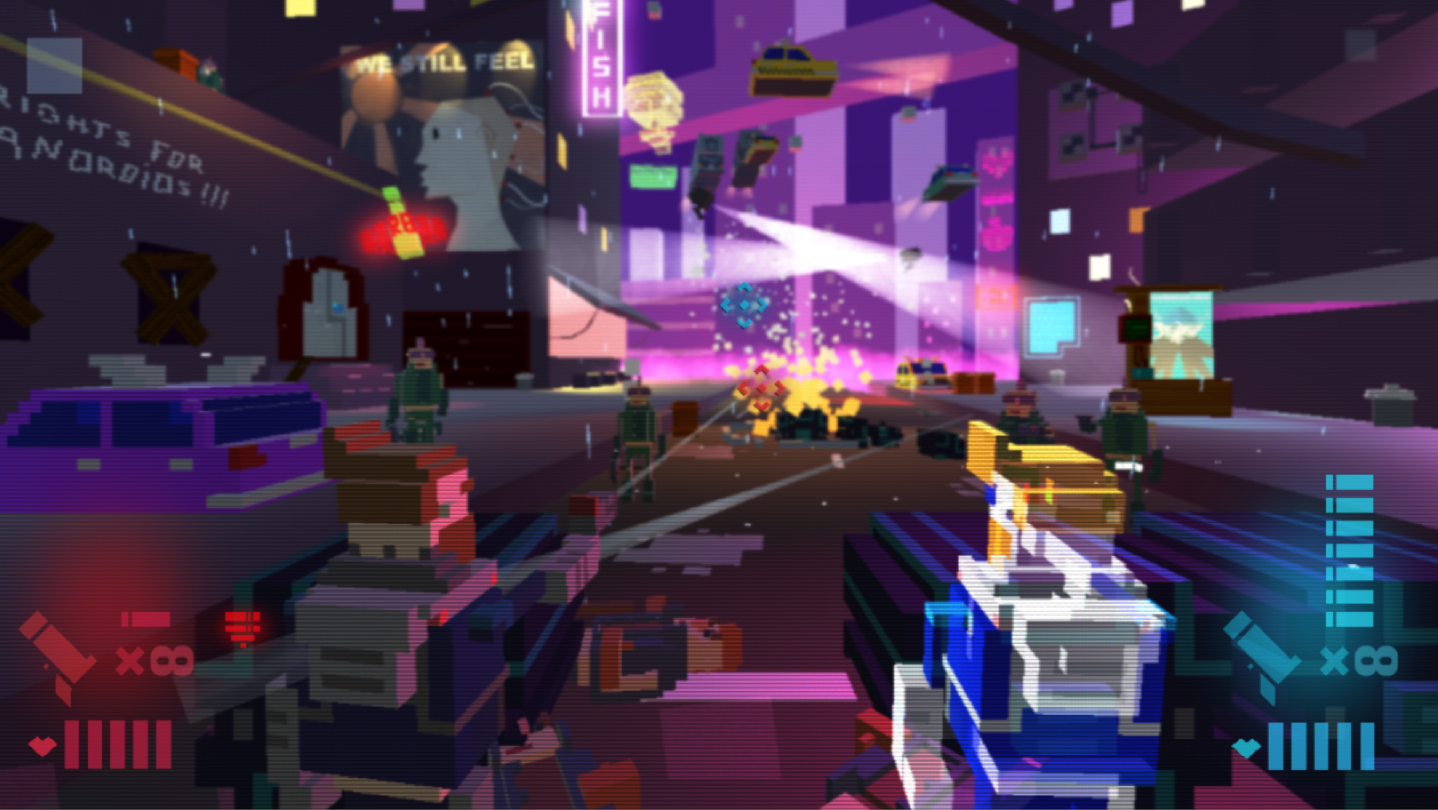 Retro cyberpunk shooter/shooting gallery to play with a friend or on your own. Shoot bad guys and bosses with different weapons, fly on cars, check the story revealed in a comic book style.