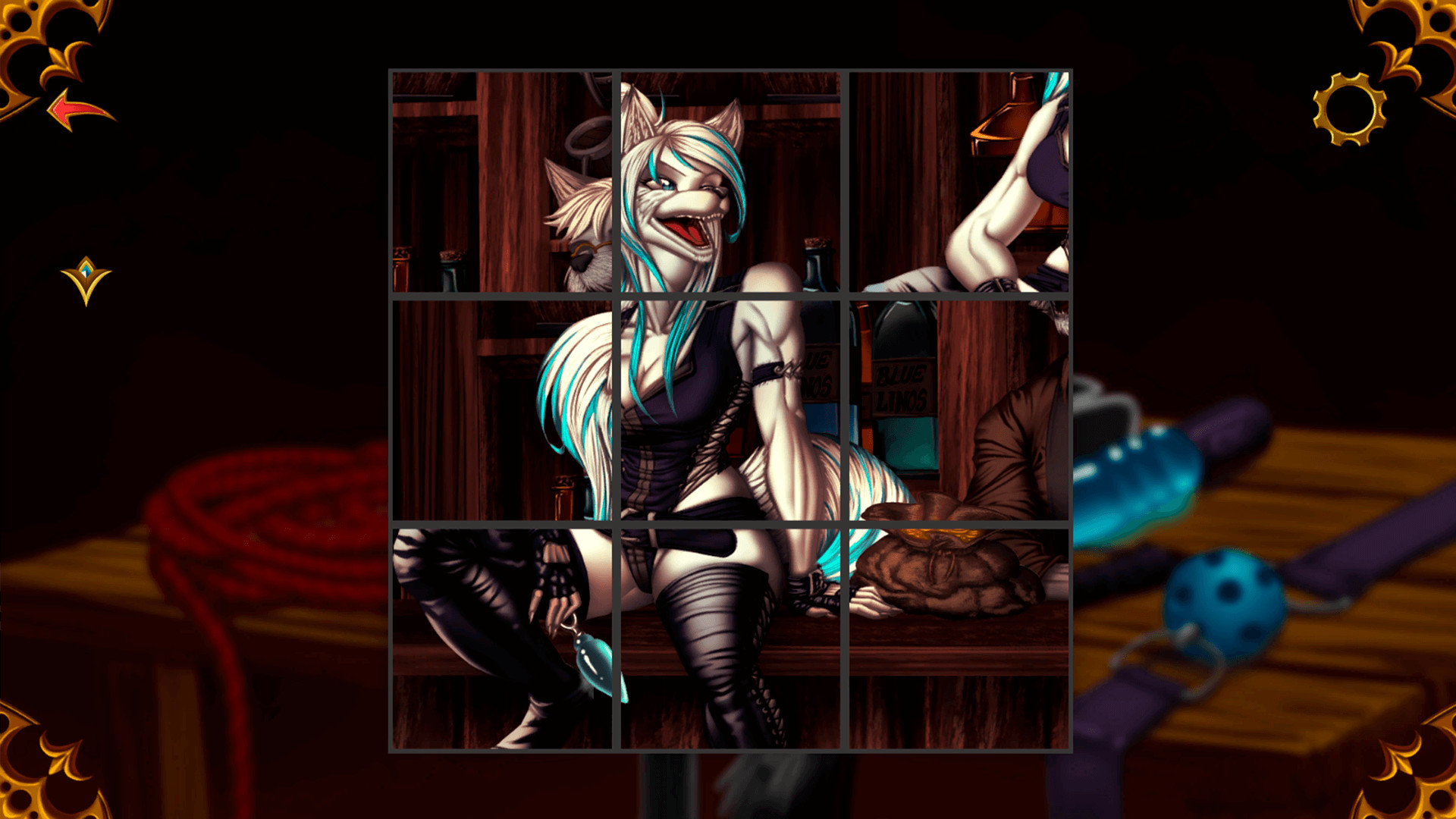 Unscramble the tiles by swapping them around and Follow a dominatrix performance. Experience a BDSM furry story inspired by the classic Girl and Goblin. Can you resist Trix's session?