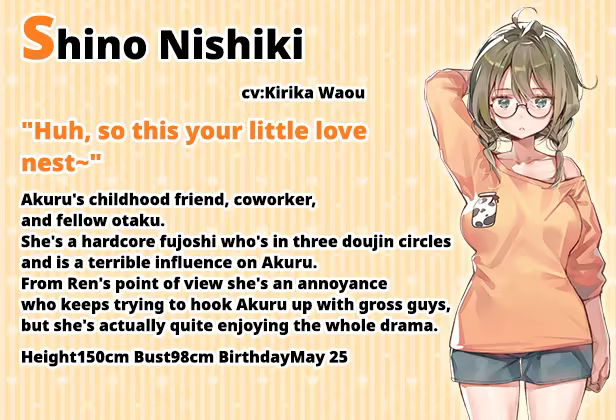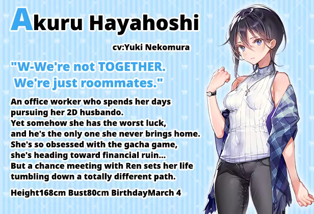 Akuru Hayahoshi is an unlucky otaku office worker who just can't pull her husbando in the gacha game she's obsessed with, no matter how much money she throws at it.