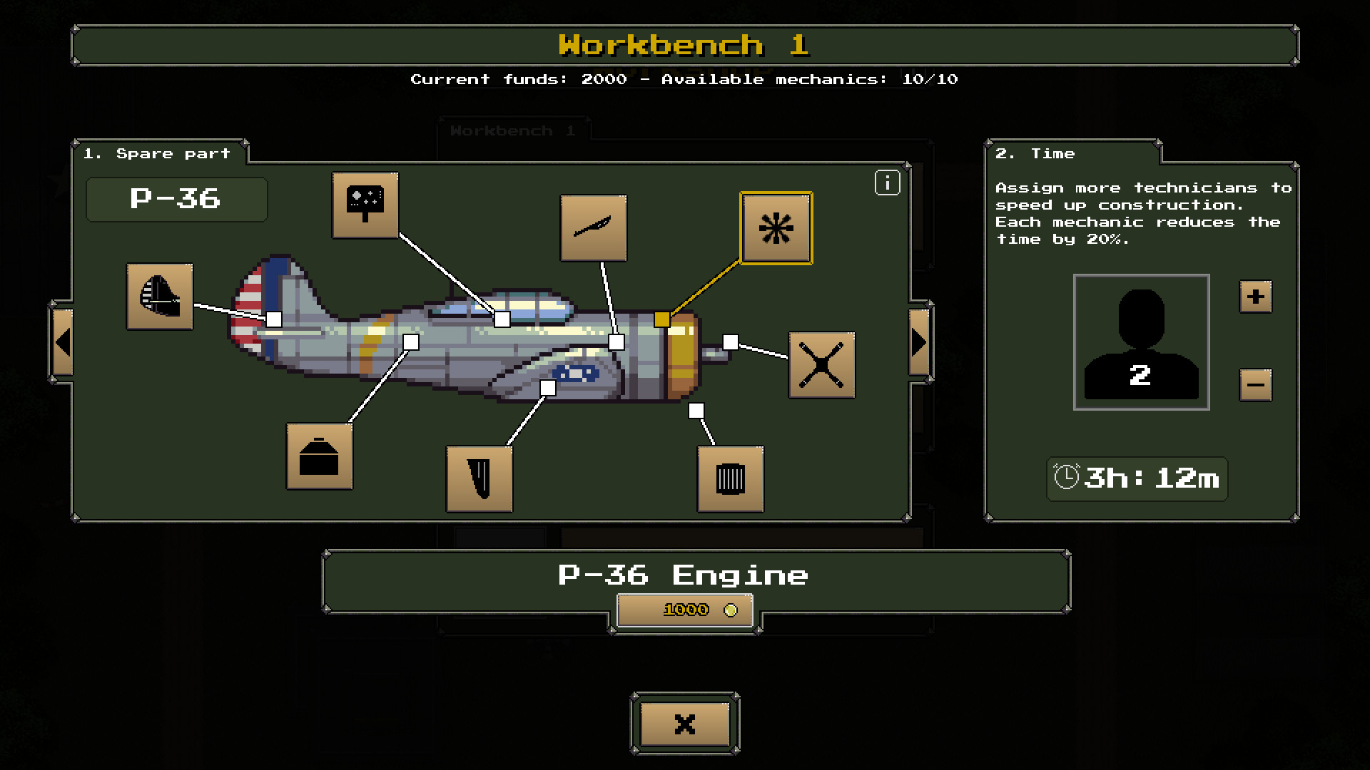 Craft components for airplanes. Choose the component and assign more mechanics to reduce construction time. Never leave the warehouse without spare parts.