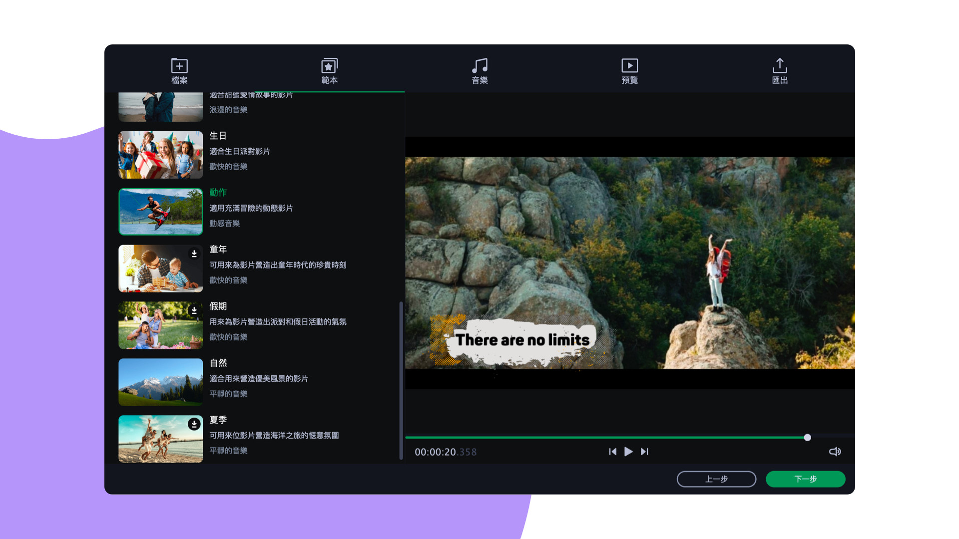 如果您才剛開始使用本程式,請嘗試使用幻燈片精靈。這是一種自動模式,可協助您立即建立影片。您只需匯入檔案並選擇主題,程式就會瞬間建立好簡報。您還可設定目標影片的長度及變更標題。