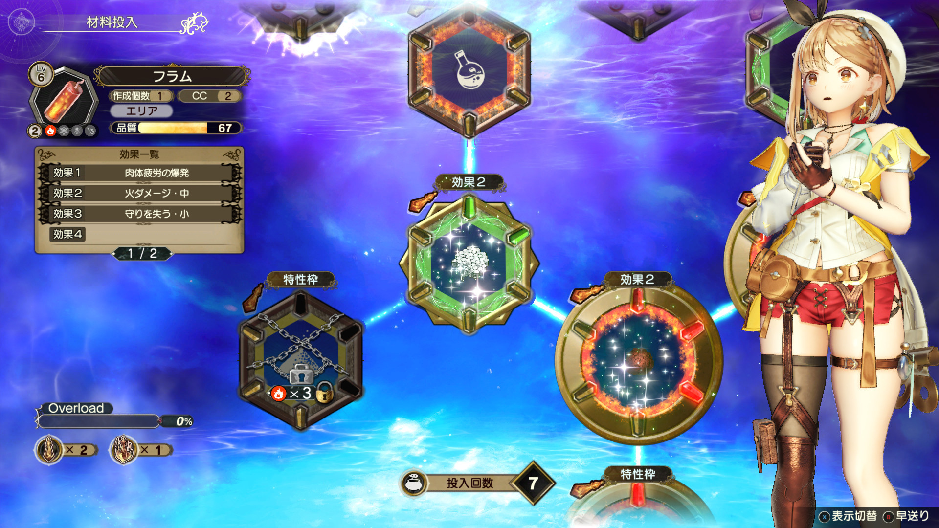 マテリアル環というマスに材料を投入していく「リンケージ調合」をよりわかりやすくし、初めての人も簡単にアイテムを作れるほか、調合上級者もこだわりのアイテムを作り出せます。作ったアイテム同士を掛け合わせる「エボルブリンク」で新たな効果やアイテムをうみだすことも!