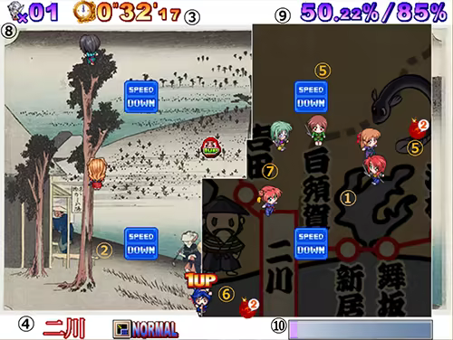 ① Main Screen The area where the enemy characters can move around. You can use the player character to remove these.