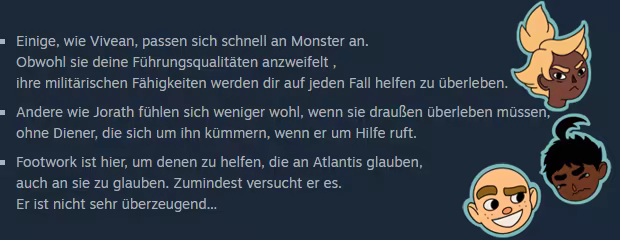 Jeder Atlanter hilft dir nicht nur im Kampf gegen Monster, sondern hat auch eine eigene Persönlichkeit. Lerne sie auf eurer gemeinsamen Reise bei zahlreichen Fluchtversuchen kennen. Hilf ihnen, ihre inneren Kämpfe zu überwinden, während ihre Häuser um dich herum im Meer versinken.
