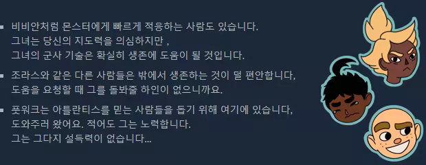 각 아틀란티스는 몬스터와 싸우는 데 도움을 줄 뿐만 아니라 독특한 개성을 지니고 있습니다. 수많은 탈출을 시도하는 동안 함께 여행하면서 그들을 알아가세요. 그들의 집이 주변 바다에 가라앉는 동안 그들이 내면의 투쟁을 극복할 수 있도록 도와주세요.