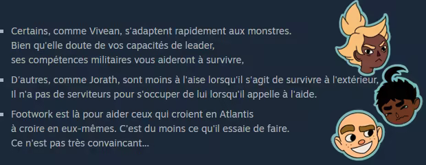 En plus de vous aider à combattre les monstres, chaque Atlante a une personnalité unique. Apprenez à les connaître au fil de vos nombreuses tentatives d'évasion. Aidez-les à surmonter leurs difficultés internes alors que leurs maisons s'enfoncent dans la mer autour de vous.