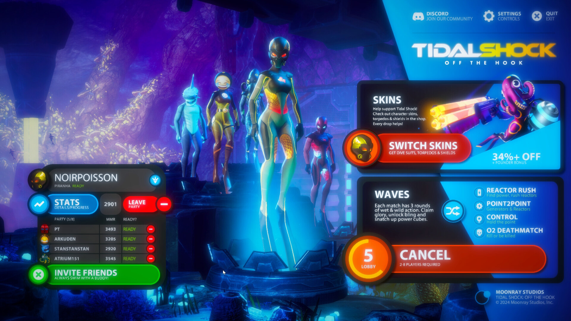 Tidal Shock: Off the Hook is a wet and wild, free-to-play, gravity-defying underwater PvP shooter! Experience liquid adrenaline: The heart-pounding, torpedo-screaming thrill of 360°combat! Dive in now!