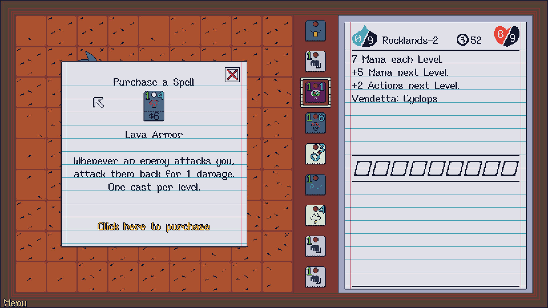 Buy new spells to become more powerful! Where you choose to place your spell is just as important as what spell you choose to buy! Choosing which spell slot to replace is important, because you'll only be able to cast that spell from that row!