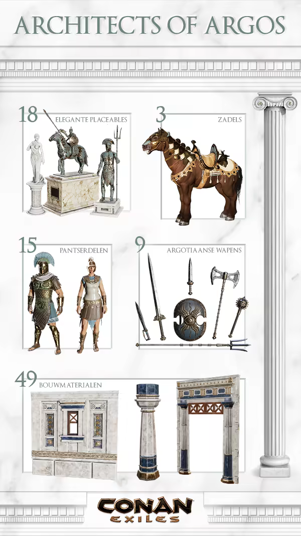 Houw adembenemende steden en schitterende tempels uit stralend wit marmer met het Architects of Argos-pack. Rust je basis uit met elegante standbeelden en dorstlessende fonteinen en maak het imposanter dan ooit tevoren!