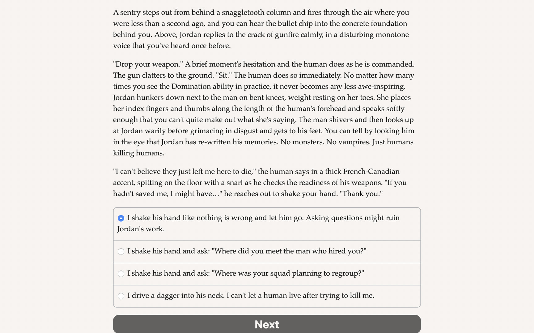 Vampire: The Masquerade — Parliament of Knives is a 600,000 word interactive horror novel by Jeffrey Dean, based on Vampire: The Masquerade and set in the World of Darkness shared story universe. Your choices control the story. It's entirely text-based—without graphics or sound effects—and fueled by the vast, unstoppable power of your imagination.