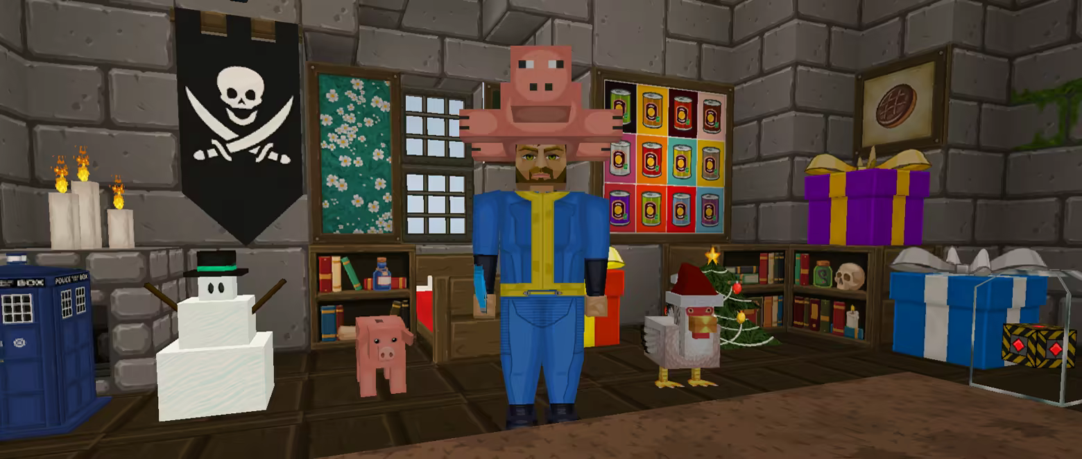 The game includes pre-built bases and building templates, a wide variety of decorative blocks and items—including arcade machines with mini-games—along with character creation, pre-made skins, and many other unique elements.