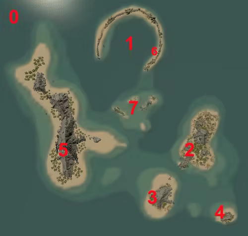 1. Half Moon Bay, 2. The Hei Tik Island, 3. Jade Island, 4. Iguana Rock, 5. Whale Island, 6. Shipwreck Atoll, 7. David's Shoals