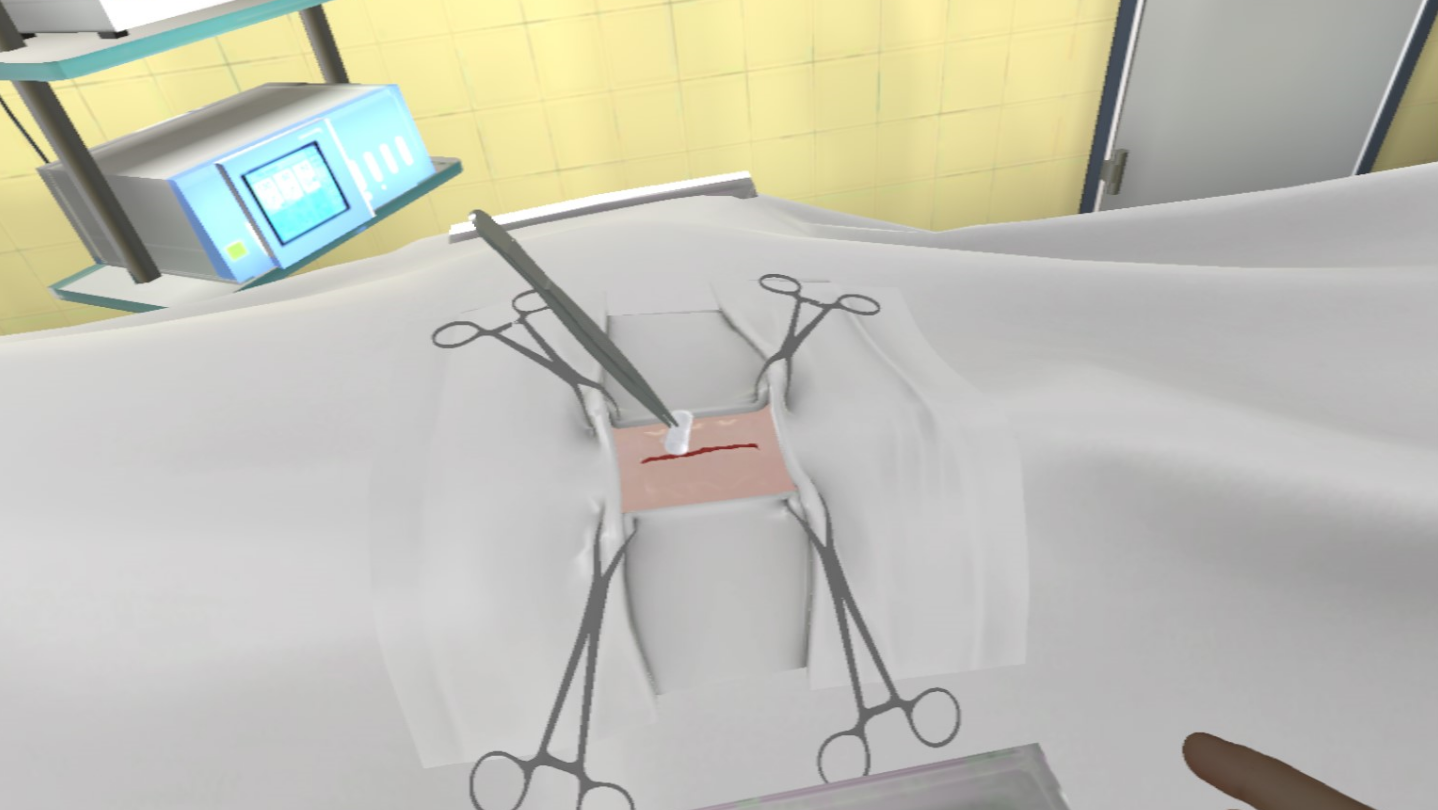 This simulator provides the best user experience and functionality by modern standards following basic VR principles. It also has innovational soft-body physics, bleeding-edge quality models of the surgical instruments and both training and test mode, allowing the user to immerse himself with his current task and quickly learn how to perform required wound treatment.