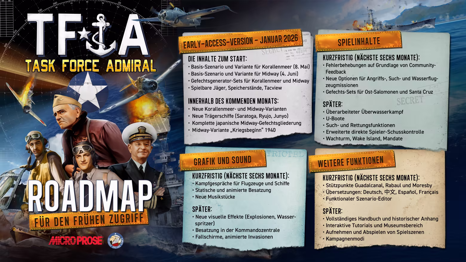 „The game currently includes two maps, along with four scenarios focusing on the decisive days of the Battle of the Coral Sea and the Battle of Midway. Two semi-random battle generator sets are provided, along with playable fighters, a savegame function and compatibility with the free third-party post-action review software Tacview®. Gameplay functions are deemed 60% complete, but the basic gameplay loop is functional, and further contents will be added based on the publicly available early access roadmap.“