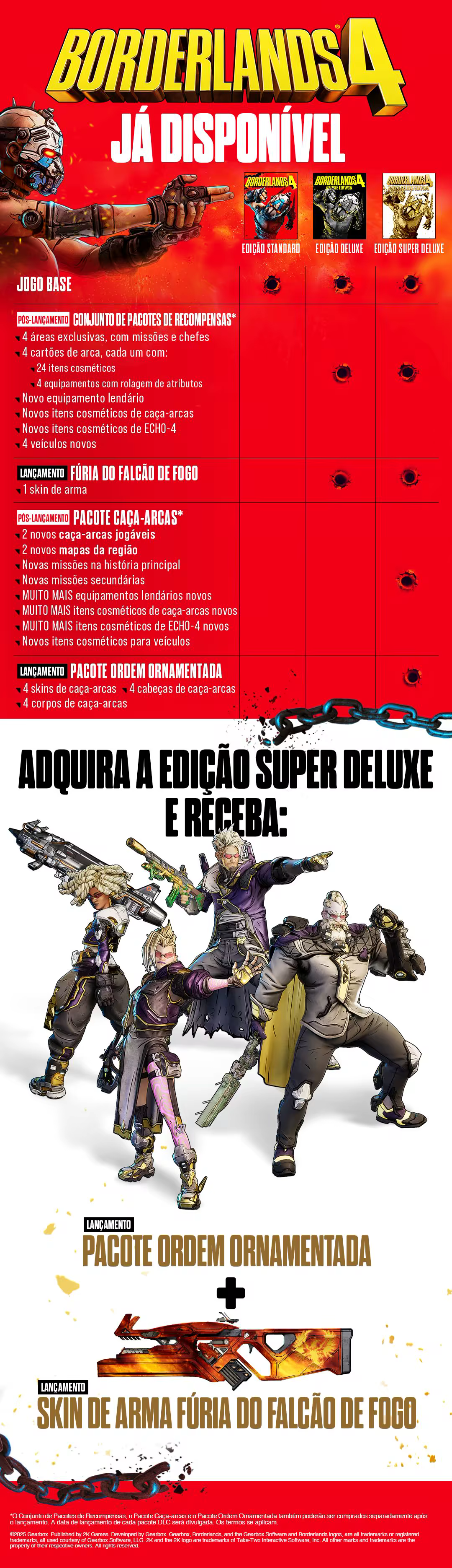 *O Conjunto de Pacotes de Recompensas de Borderlands 4 consiste em quatro pacotes DLC pós-lançamento separados: pacotes 2, 3, 4 e 5. Esse Conjunto está incluído nas edições Deluxe e Super Deluxe de Borderlands 4. O conjunto e seus pacotes DLC individuais poderão ser adquiridos separadamente a partir do lançamento (requer o jogo base). A data exata de lançamento de cada pacote DLC será anunciada futuramente e estará sujeita a alterações. Os termos se aplicam.