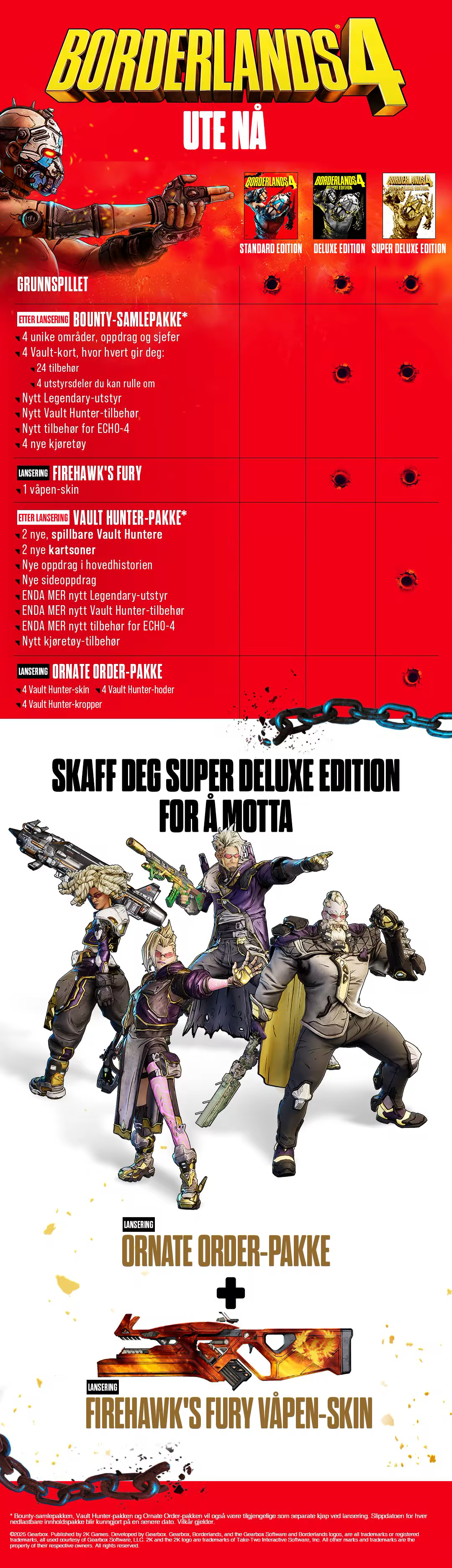 * Bounty-samlepakken for Borderlands 4 består av fire ulike nedlastbare innholdspakker som slippes etter lanseringen av hovedspillet: Bounty Pack 2, 3, 4 og 5. Bounty-samlepakken er inkludert i Deluxe Edition og Super Deluxe Edition av Borderlands 4. Bounty-samlepakken og de individuelle nedlastbare innholdspakkene som inngår i samlepakken, vil også bli tilgjengelige for separate kjøp ved lansering (krever grunnspillet). De nøyaktige lanseringstidspunktene for hver nedlastbare innholdspakke blir annonsert på et senere tidspunkt og kan endres. Vilkår gjelder.