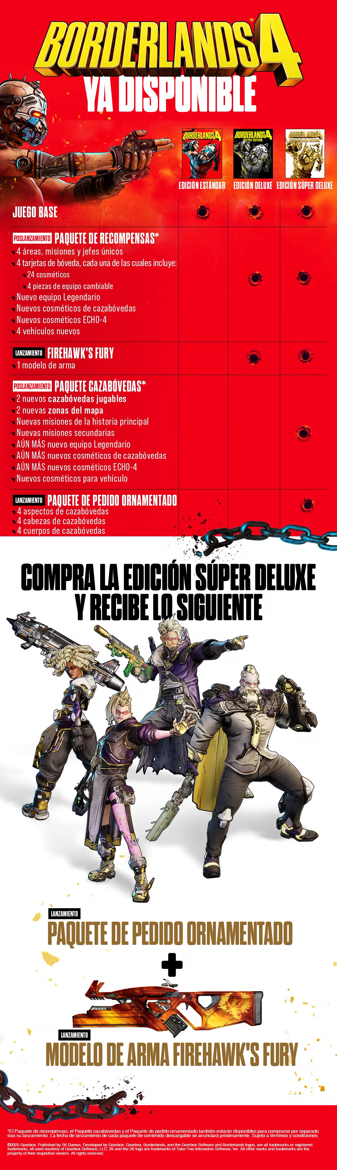 *El paquete de recompensas de Borderlands 4 consta de cuatro paquetes de contenido descargable independientes que se lanzarán tras el lanzamiento del juego: los paquetes de recompensas 2, 3, 4 y 5. El paquete de recompensas se incluye con las ediciones Deluxe y Super Deluxe de Borderlands 4. El paquete de recompensas y los paquetes de contenido descargable individuales que lo componen también podrán adquirirse por separado en el momento del lanzamiento (se requiere el juego base). El calendario exacto de lanzamiento de cada paquete de contenido descargable se anunciará más adelante y está sujeto a cambios. Sujeto a términos.