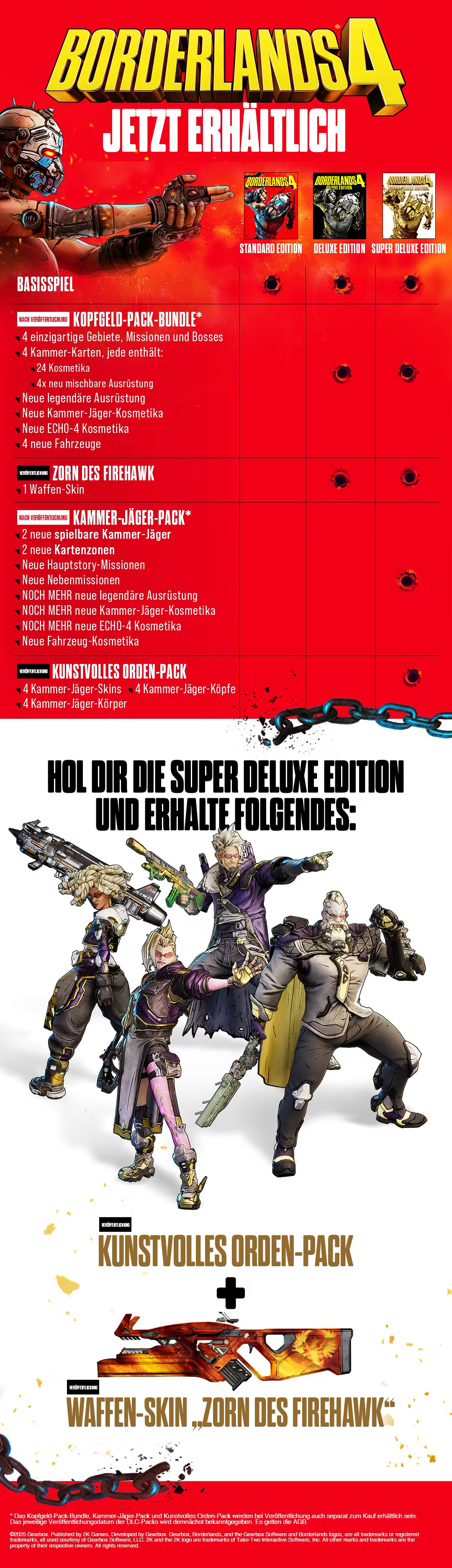 ** Das Borderlands 4 Kopfgeld-Pack-Bundle besteht aus zwei separaten DLC-Packs nach der Veröffentlichung. Das Kammer-Jäger-Pack ist in der Borderlands 4 Super Deluxe Edition enthalten. Das Kammer-Jäger-Pack und die einzelnen DLC-Packs, aus denen das Bundle besteht, werden ebenfalls bei der Veröffentlichung separat zum Kauf erhältlich sein (Basisspiel erforderlich). Die genauen Veröffentlichungstermine der DLC-Packs werden zu einem späteren Zeitpunkt bekanntgegeben und können sich ändern. Es gelten die AGB.