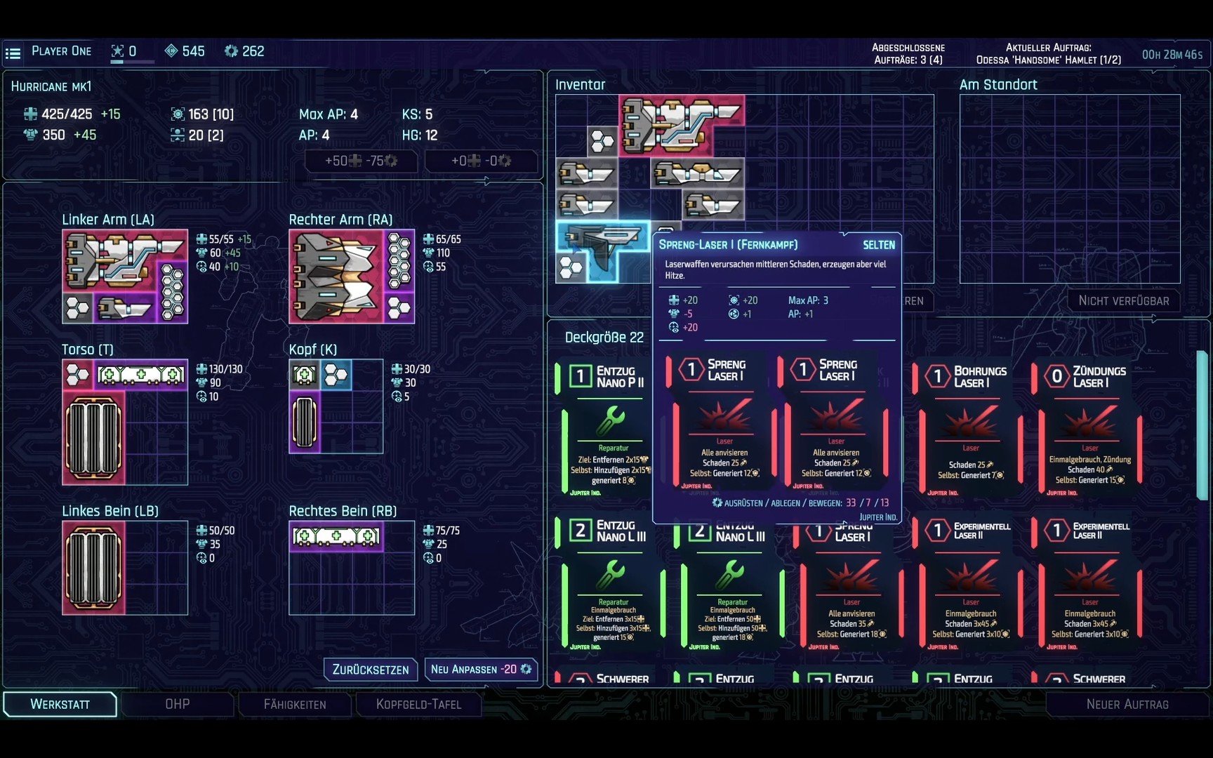Jedes Körperteil des Mechs hat seine eigene Rüstung und Gesundheit. Gleiche deine Ausrüstung an, um dein Deck effizient zu halten und genug Schutz bereitzustellen. Wenn ein Körperteil zerstört wird kannst du keine Karten, die dazu gehören, ausspielen!