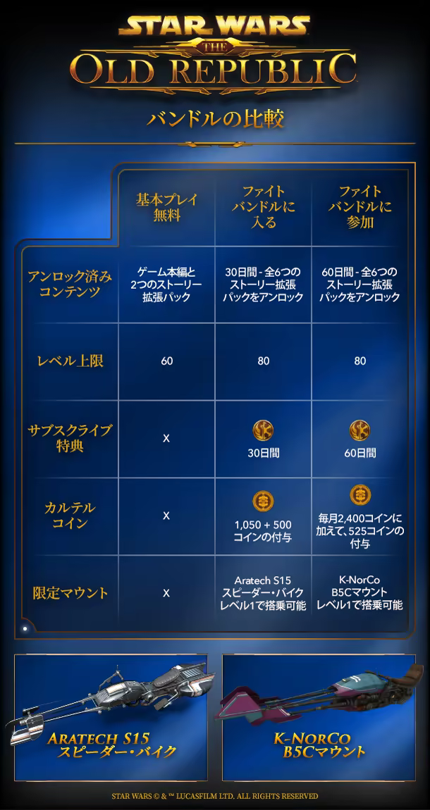 サブスクリプション特典。STAR WARS: The Old Republic」では、STAR WARSの世界をさらに楽しめるサブスクリプション(定額課金)オプションが用意されています。サブスクリプションの特典には、レベル上限の80への引き上げと、以下の最新エキスパンションへのアクセスが含まれます。「シスの遺産」「Onslaught」「Knights of the Eternal Throne」「Knights of the Fallen Empire」。加えて、月ごとのカルテル・コインの受け取りや、XPボーナスなどの特典も受けられます。サブスクリプションの詳細についてはサブスクライバーのページをご覧ください。