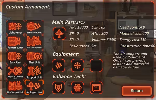 The vanguard (hero unit) that the player controls also has a large customization space.