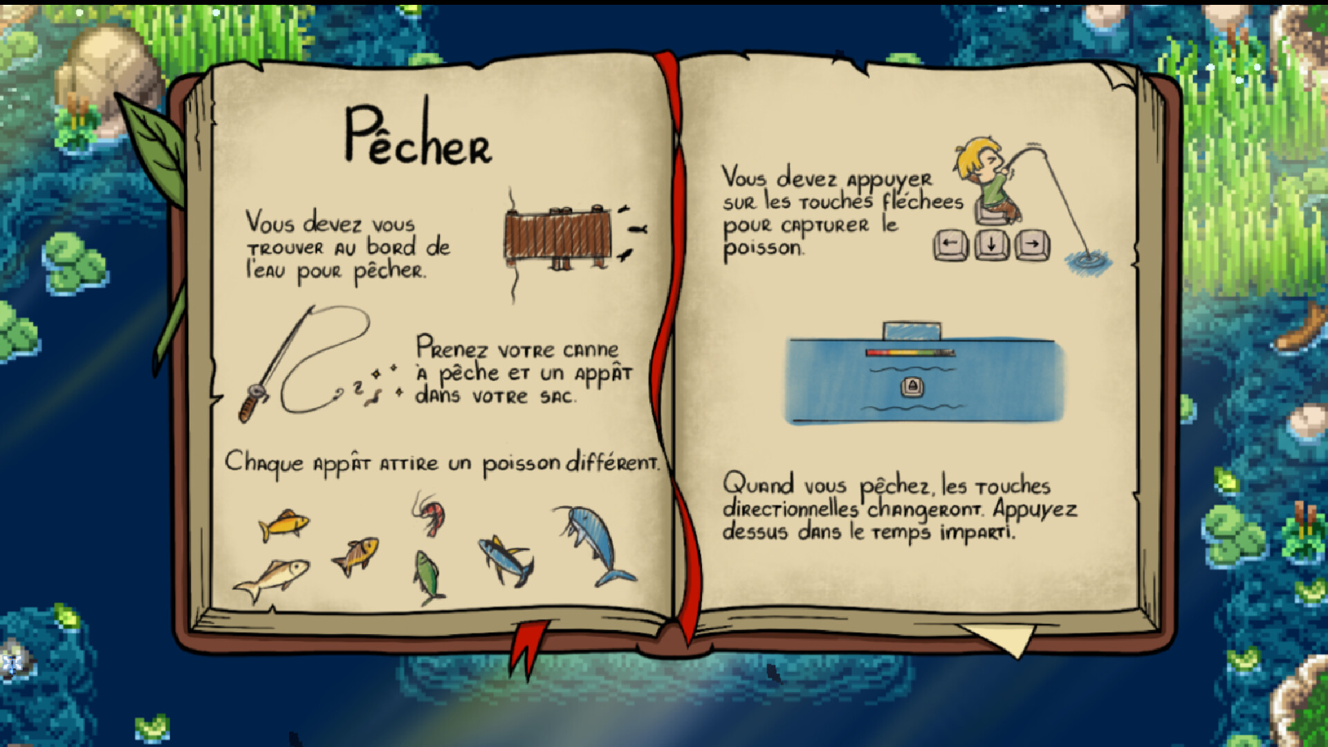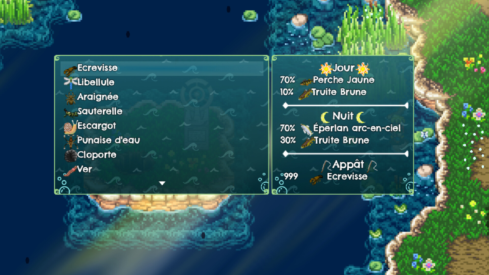 • Vous pouvez pêcher des tonnes de poissons différents sur l'île. Chacun possède son propre caractère et habitat. Selon les conditions, si vous pêchez le jour ou la nuit, ou dans un coin reculé de l'île, vous attraperez différentes espèces de poissons. À condition d'utiliser le bon appât au bon moment. Vous pouvez ensuite cuire les poissons et les manger pour gagner en bénédiction et en endurance pendant que vous pratiquerez des activités telles que l'agriculture.