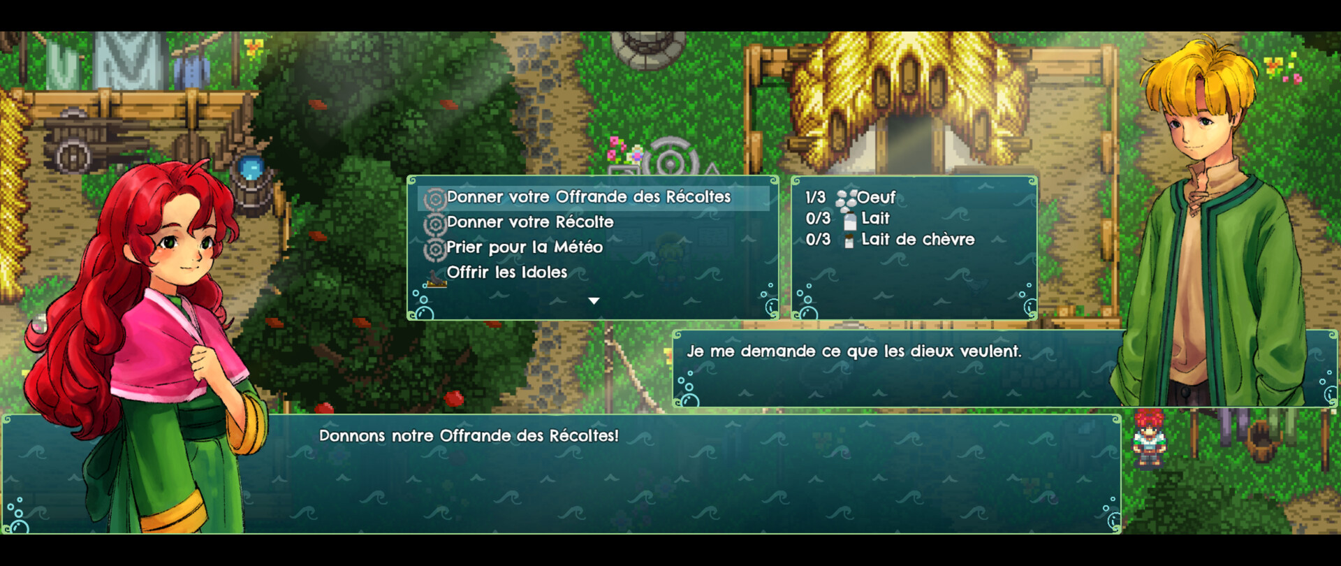• Les dieux jouent un rôle important dans Harvest Island. Tous les jours, ils vous demanderont des objets provenant de l'île. Vous recevez une bénédiction de leur part une fois que vous leur apportez ces objets. Vous pouvez utiliser cette bénédiction pour améliorer votre ferme ou fabriquer des objets.