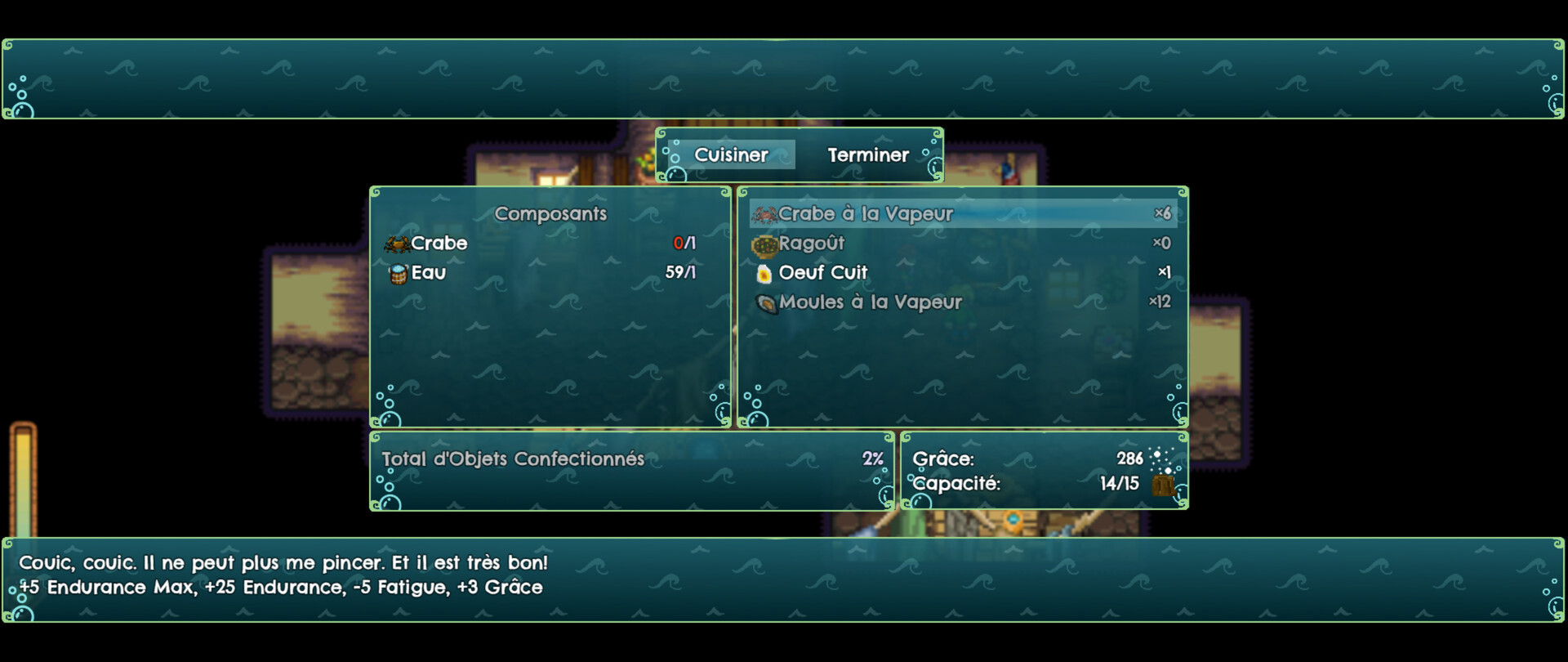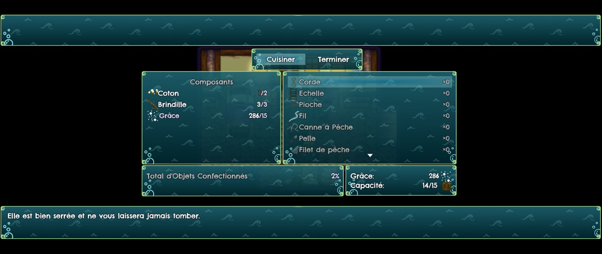 • Vous pouvez fabriquer divers outils depuis votre établi pour vous aider à avancer dans votre exploration de l'île, comme une échelle, une corde et une canne à pêche. Ces outils vous permettront de progresser dans l'histoire et de prendre soin de vos cultures.