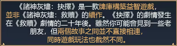 《諸神灰燼:抉擇》是一款融合了文字角色扮演、牌組構建和回合制戰旗的新型遊戲——您在上述領域的抉擇都會影響故事的結局。