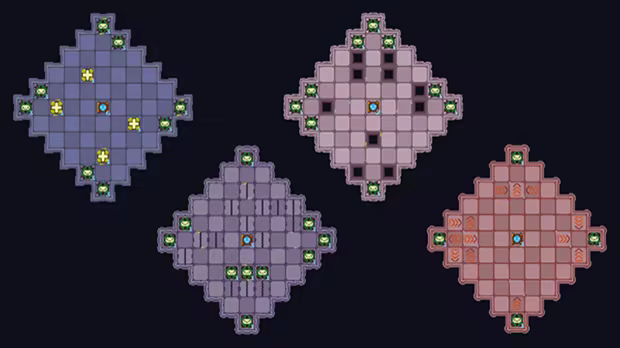 The test rooms are the only location in the game, but as the game progresses, you pass through the four different areas represented by new tilesets. The areas introduce new mechanics with which Q.T. must repeat the process of level completion in challenging and interesting ways while still using its core unique mechanic.