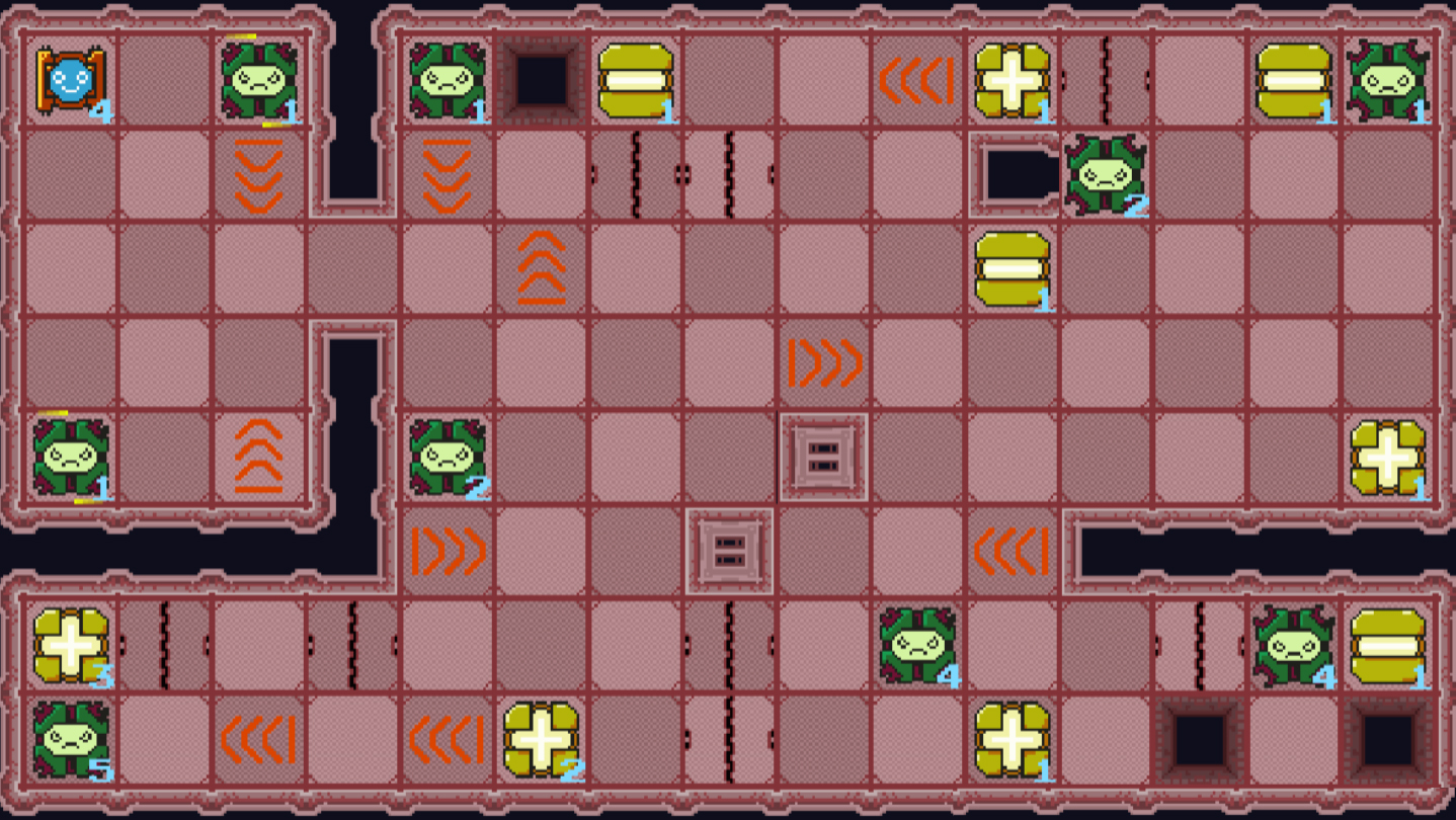 The test rooms are the only location in the game, but as the game progresses, you pass through the four different areas represented by new tilesets. The areas introduce new mechanics with which Q.T. must repeat the process of level completion in challenging and interesting ways while still using its core unique mechanic.