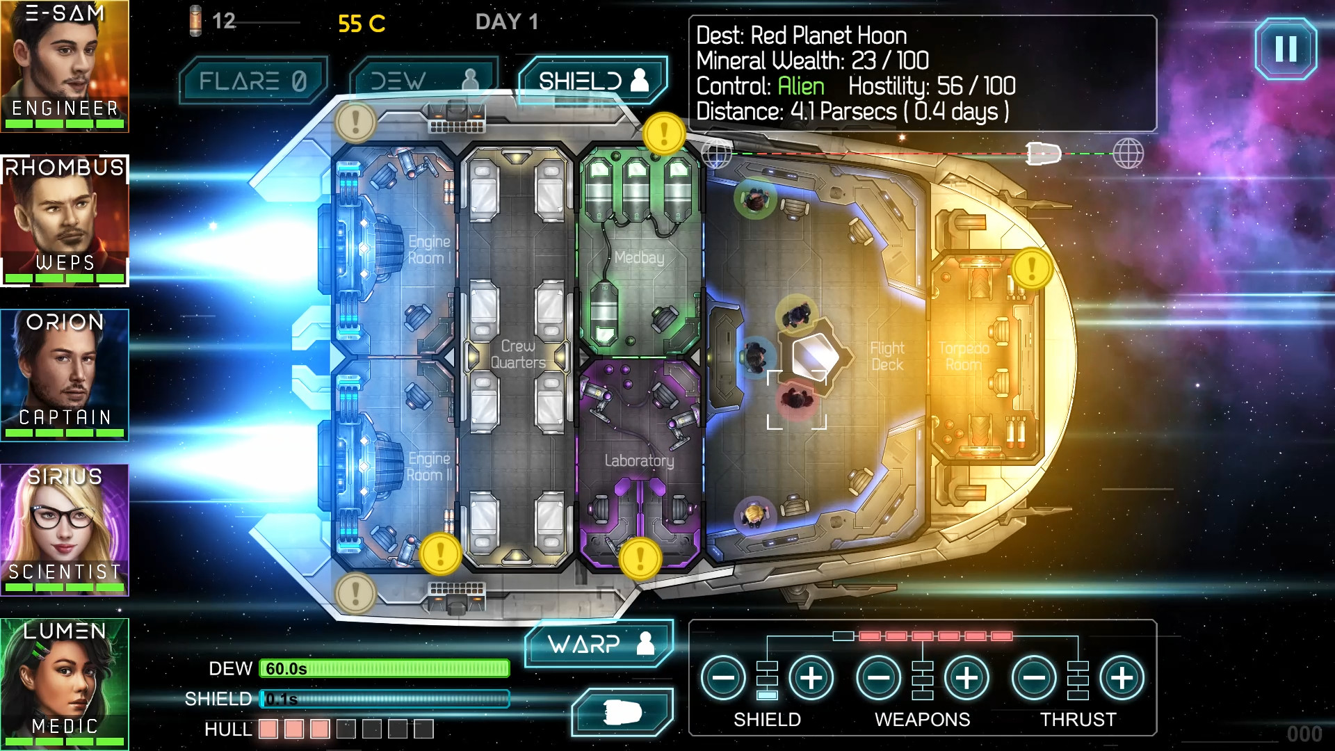 The essence of the Heliconian is to manage a mixed crew of renegades aboard the starship Heliconian. Manage the crew member’s actions and the ship’s functions to survive as long as possible while exploring the star system in the hopes of earning upgrades and ultimately a safe haven.